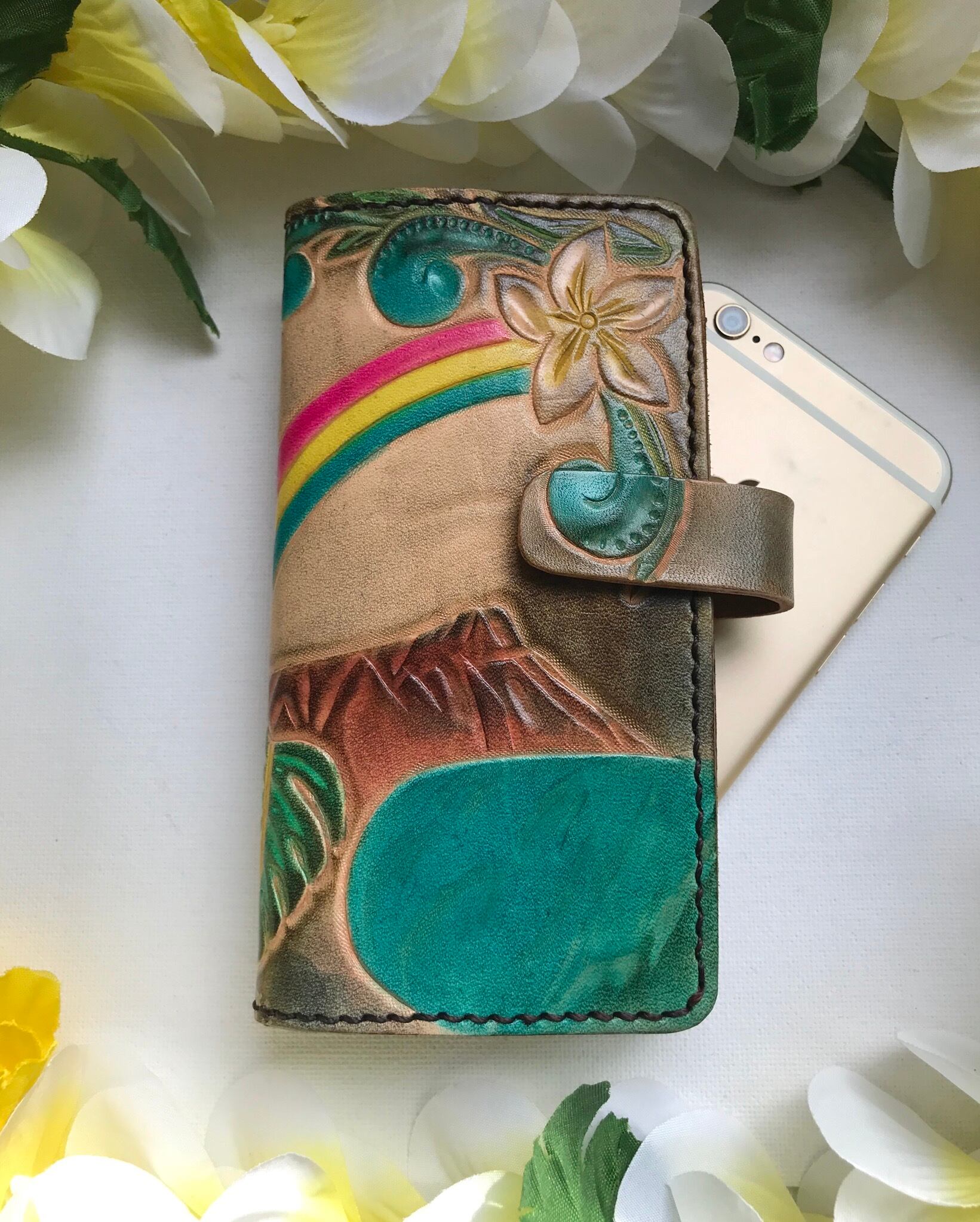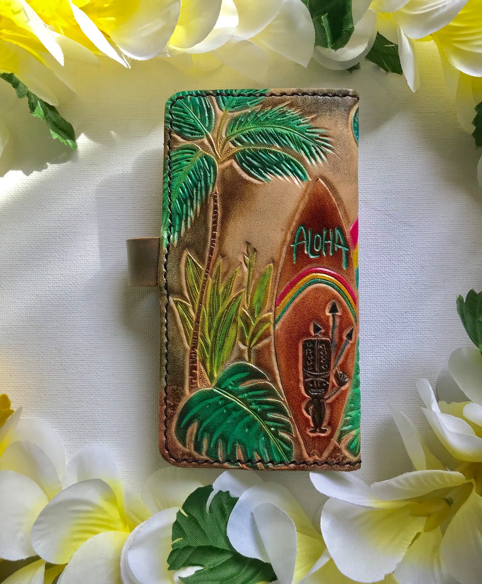 牛革にハワイの風景をデザインした、手帳型スマホケースです。