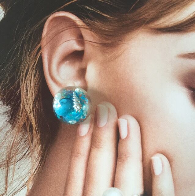 半球型のピアスで、角度によってキラキラします。透ける感じの仕上がりですので、涼しげで可愛らしいです。南国旅行でワンピースや普段のカジュアルなパンツと合わせても可愛いです(*^-^*)