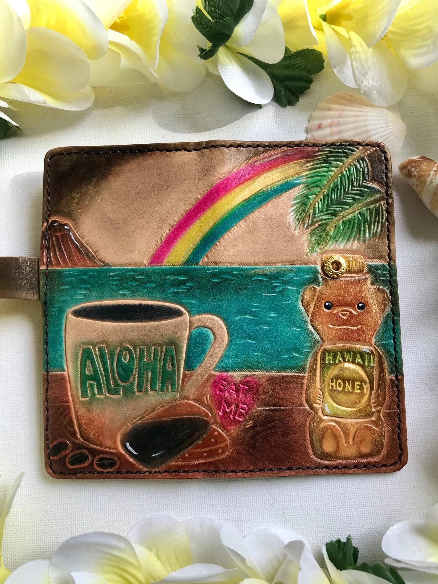 牛革にハワイの風景をデザインした、手帳型スマホケースです